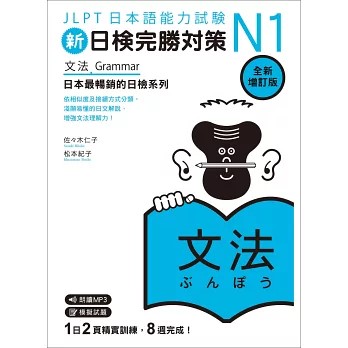 本系列因其簡單易懂的特色,引導學習者循序漸進、養成實力,上市以來,一直是日檢類的冠軍書。全新增訂版的《新日檢完勝對策N1:文法》,維持以日常生活為主題發展N1相關句型,「備考」與「實用」功能兼具。每日以形態、意思或接續方式類似的3~4個句型為一主題。學習目標明確,同時也能辨別運用上的差異,以8週完成訓練目標。